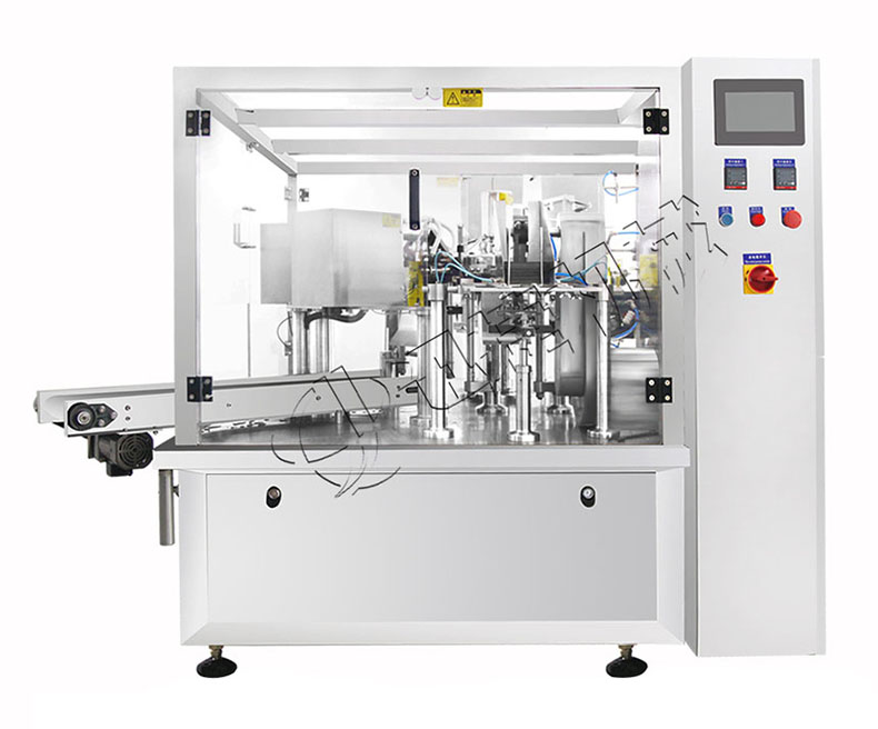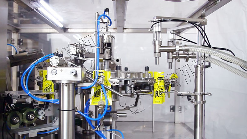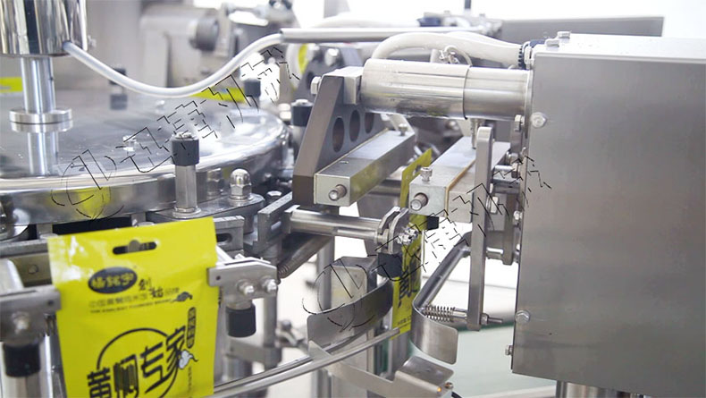全自動給袋式醬料包裝機由給袋式包裝機、醬料灌裝機配套組成,帶醬料攪拌裝置,防止微顆粒物料沉淀,帶料位控制裝置。全自動給袋式醬料包裝機適用于包裝醬料、漿體物料,如烤肉醬、燒烤醬、番茄醬、辣椒醬、豆瓣醬等物料的袋裝。本全自動給袋式醬料包裝機符合食品加工機械的衛生標準。機器上與物料和包裝袋接觸的零部件均采用符合食品衛生要求的材料加工,保證食品的衛生和安全。包裝袋類型有自立袋(帶拉鏈與不帶拉鏈)、平面袋(三邊封、四邊封、手提袋、拉鏈袋)、紙袋等復合袋。