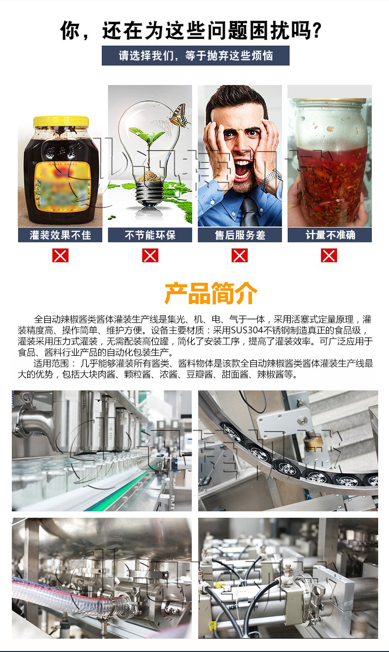 全自動醬類灌裝機幾乎能夠灌裝所有醬類、醬料物體是該款全自動辣椒醬類醬體灌裝生產線大的優勢,包括大塊肉醬、顆粒醬、濃醬、豆瓣醬、甜面醬、辣椒醬等。