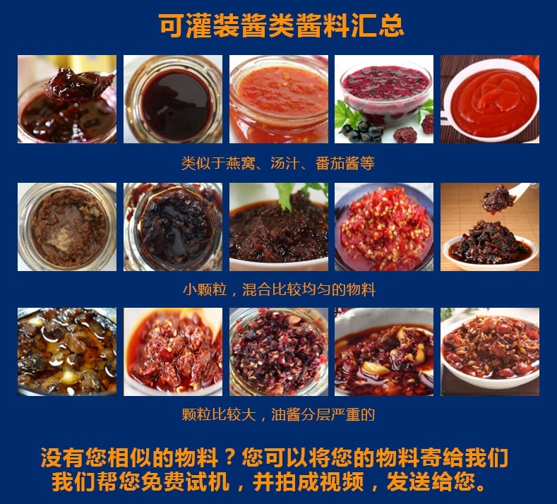 全自動2頭醬料灌裝機幾乎能夠灌裝所有醬類、醬料物體是該款全自動2頭醬料灌裝主要的優勢,包括大塊肉醬、顆粒醬、濃醬、豆瓣醬、甜面醬、辣椒醬等。